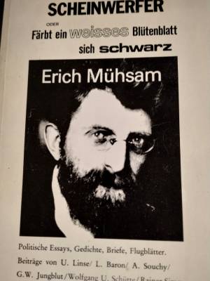 Buchtitel: Scheinwerfer - oder färbt ein weisses Blütenblatt sich schwarz - mit Portrait #ErichMuehsam, politische Essays, Gedichte, Briefe, Flugblätter. Beiträge von U.Linse /l.Baron / a.souchy / g.w.jungblut / wolfgang u. Schütte / rainer simon 1978" title="Buchtitel: Scheinwerfer - oder färbt ein weisses Blütenblatt sich schwarz - mit Portrait #ErichMuehsam, politische Essays, Gedichte, Briefe, Flugblätter. Beiträge von U.Linse /l.Baron / a.souchy / g.w.jungblut / wolfgang u. Schütte / rainer simon 1978